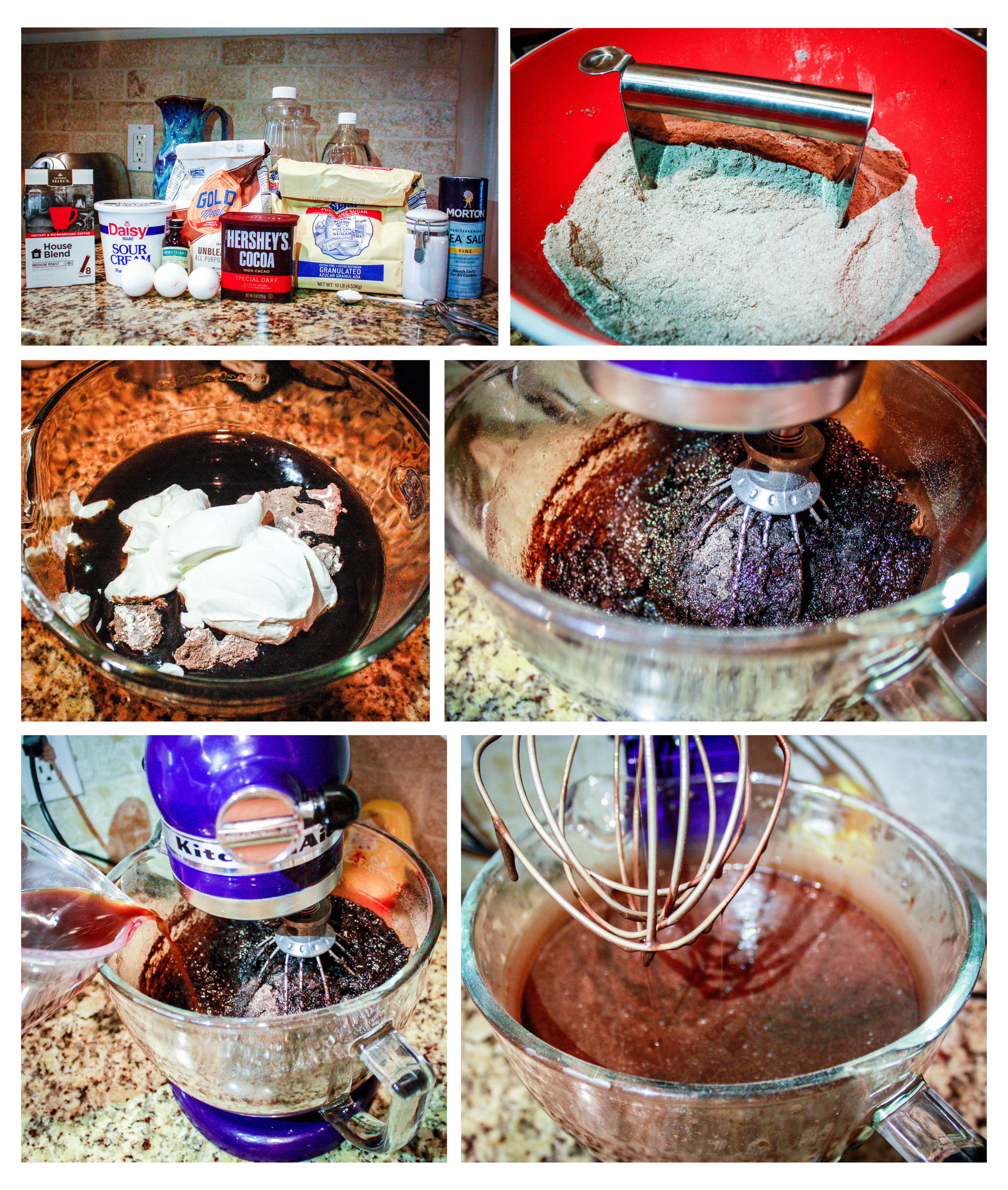 - Add the 3/4c oil and 3/4c sour cream and whisk to blend. Mix in the 1 1/8c coffee a ½ cup at a time. Blend in the 1 1/2T vinegar and 3/4t vanilla. Whisk in the 2 eggs and beat until well blended. Scrape down the sides of the bowl and be sure the batter is well mixed.