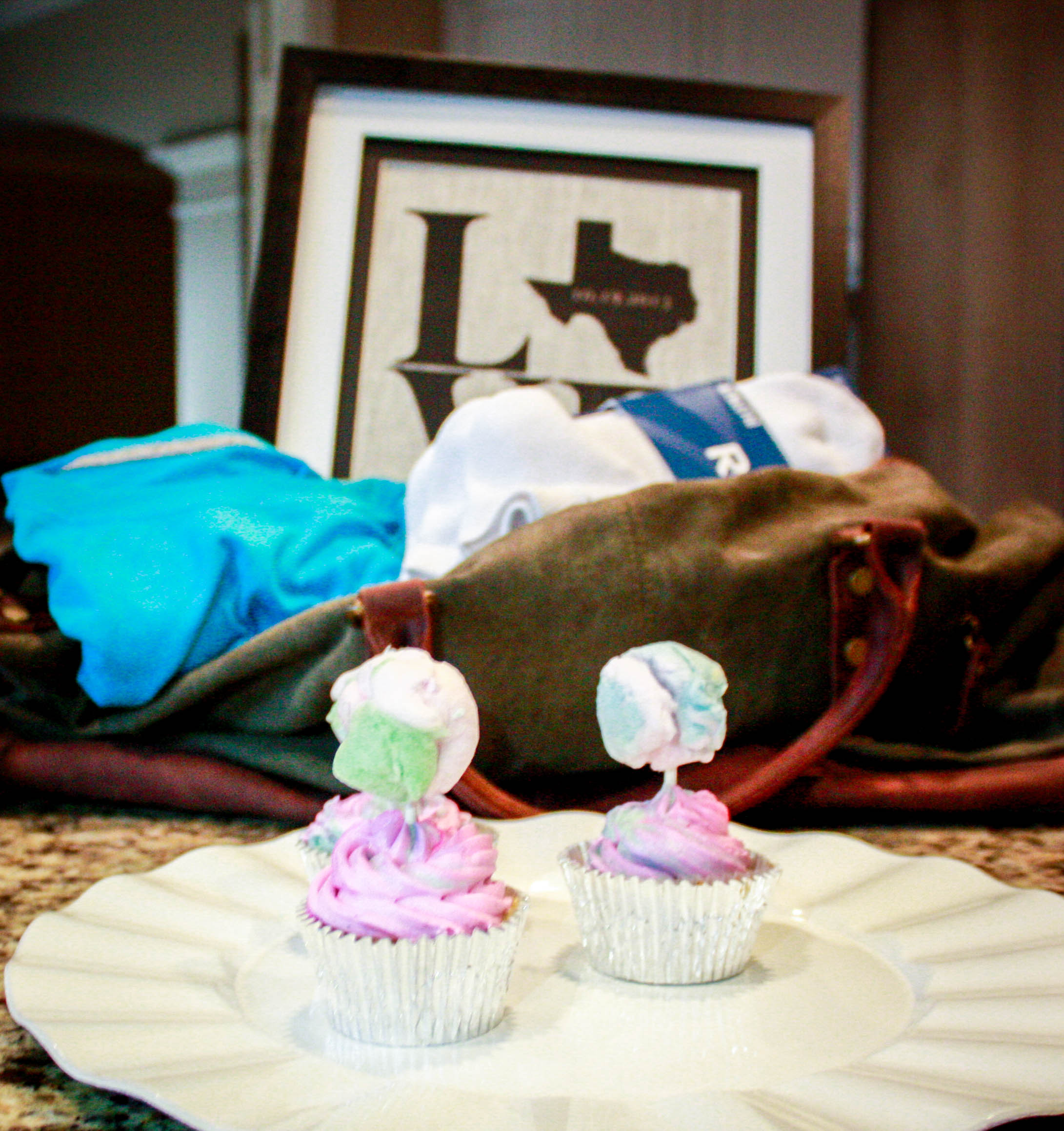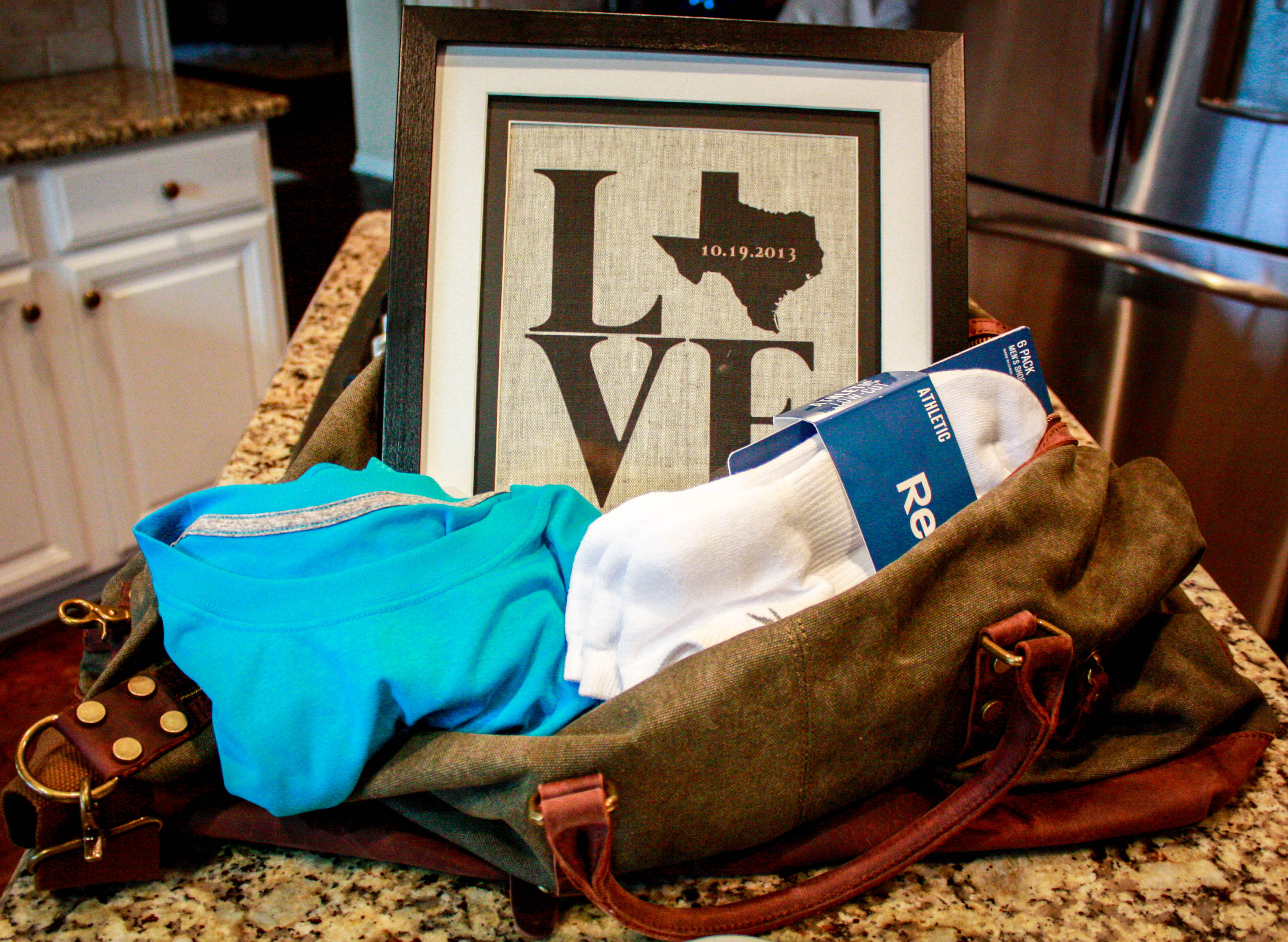 Two years ago today, I married my best friend and soulmate. We have so much fun together and I wouldn’t change a thing about our marriage. For those of you who are married, you are probably familiar with traditional anniversary gifts. The two year anniversary traditional gift is Cotton. Cotton was not the easiest thing to create a good guy gift, but I had a lot of fun coming up with it. So if you are looking for a good Cotton anniversary gift, I’m happy to share mine. His gift included: (1) a “LOVE” graphic with our wedding date and state we got married in (and live in) printed on cotton and framed (purchased on Etsy); (2) a really nice canvas and leather duffle bag; (3) his favorite cotton dry-fit Nike shirt; (4) some new running socks; and finally (5) cotton candy cupcakes to top off my ultimate Cotton gift! Obviously, I got a little carried away with the cotton theme… but I enjoy putting fun gift packages together.